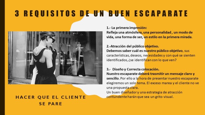El escaparate es el primer contacto visual de los viandantes con nuestro negocio, su objetivo es llamar la atención y hacer que se detengan, si lo que ven es atractivo conseguiremos que entren a visitar nuestro establecimiento. Elegir correctamente los elementos visuales, la selección de productos, su colocación en el espacio, harán ese efecto llamada al espectador, como si se tratara de un espectáculo visual a pie de calle.