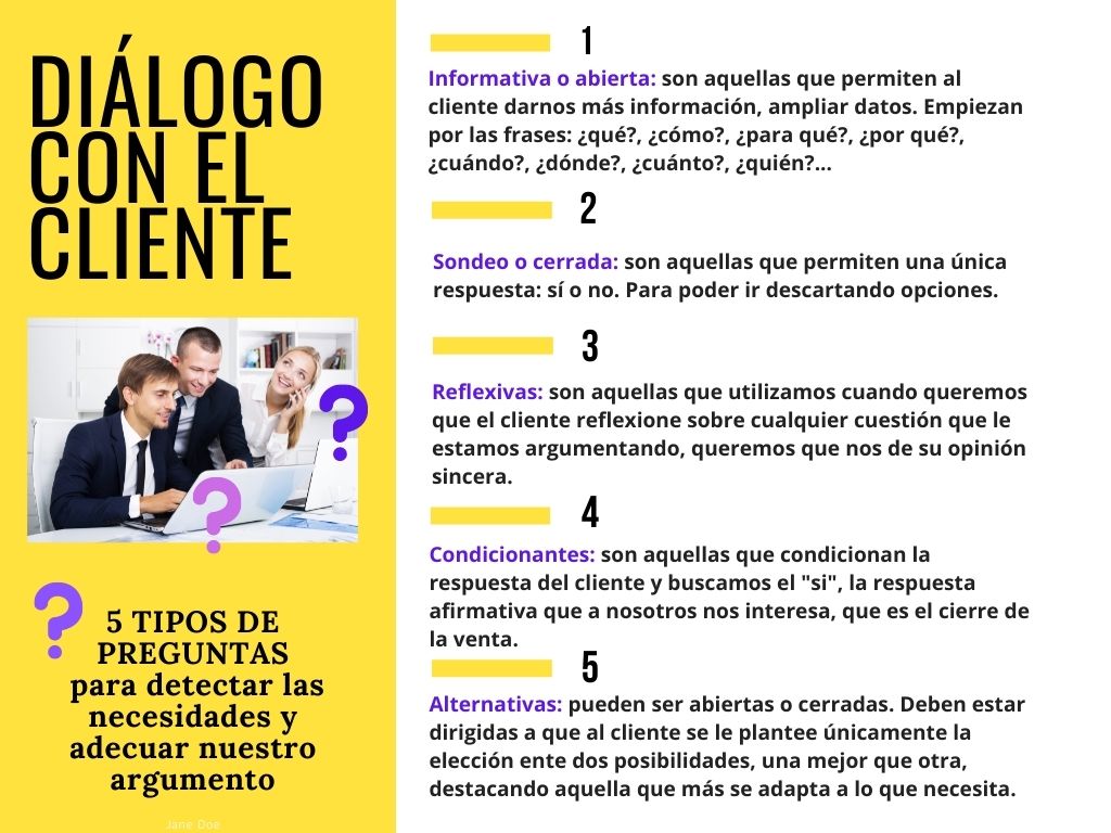 1.-Informativa o abierta: Se utilizan cuando comenzamos hablar con el cliente son preguntas que permiten explicar más ampliamente, obtener información, detectar las necesidades reales del cliente, que pueda expresarse libremente y conocer sus costumbres y hábitos de consumo. También nos permite saber si tiene otros proveedores o trabaja con la competencia.